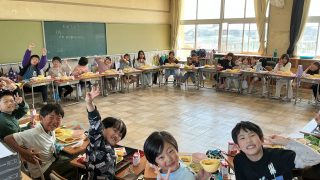 2年生最後の日には、輪になって給食を食べました。輪になったことで、みんな笑顔で給食を食べていました。