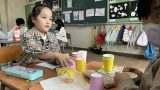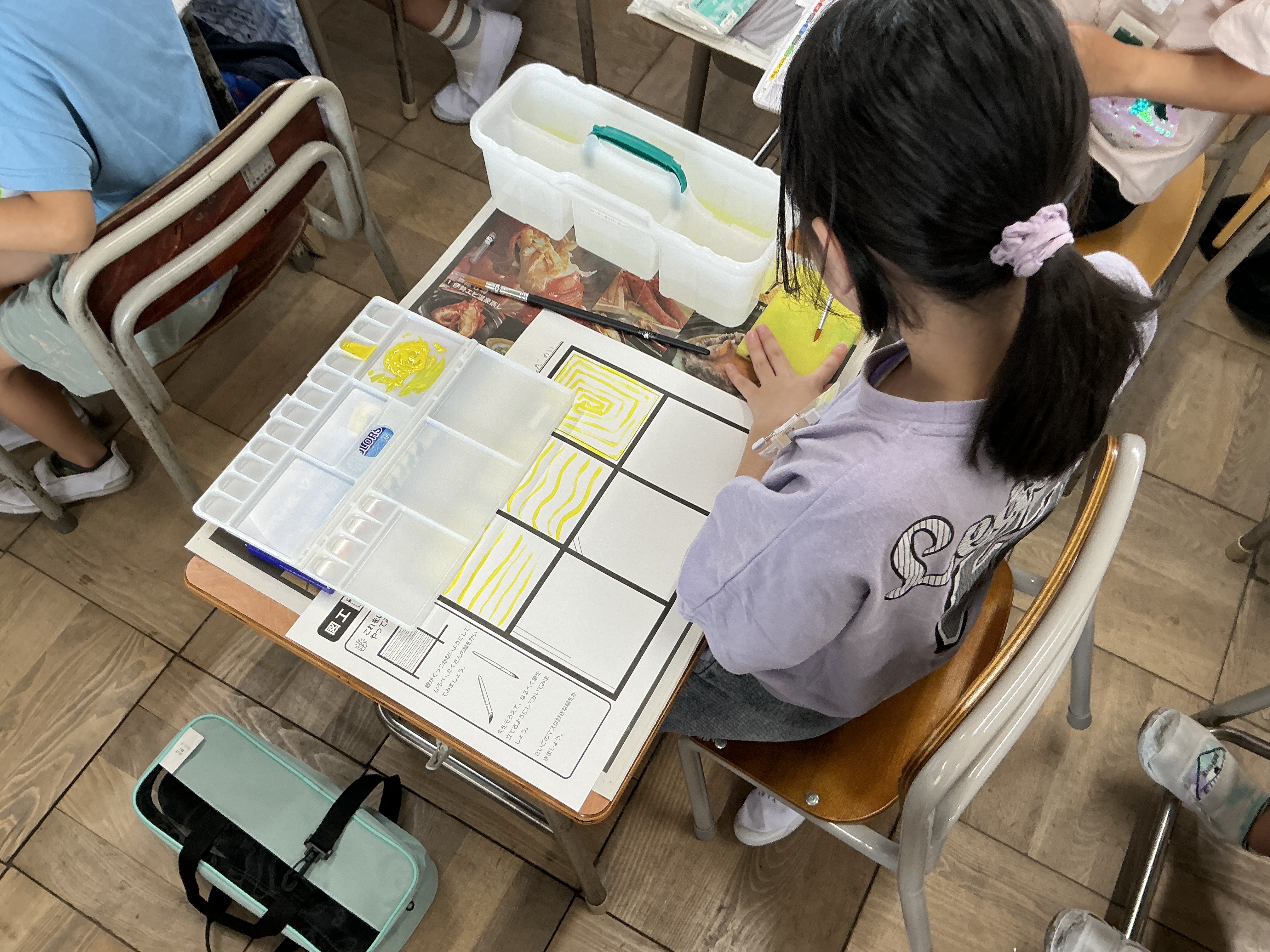 9月11、12日の図画工作科の時間に、絵の具の使い方を学びました。パレットに少しの絵の具を出して、それを水で溶かすと色の濃さが変わることに気づきました。