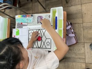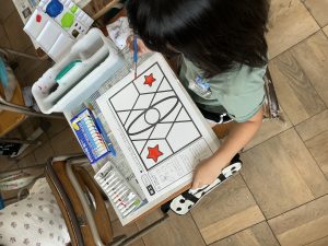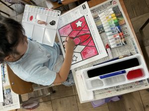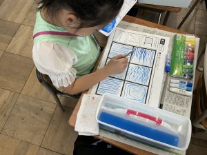 子どもたちは、「うすくなる」「きれい!」と目を輝かせながら夢中で筆を動かしていました。
