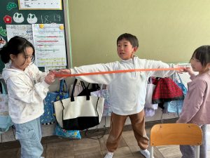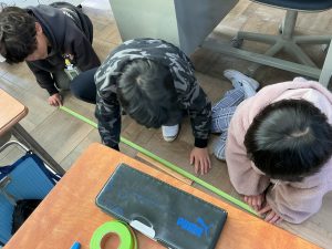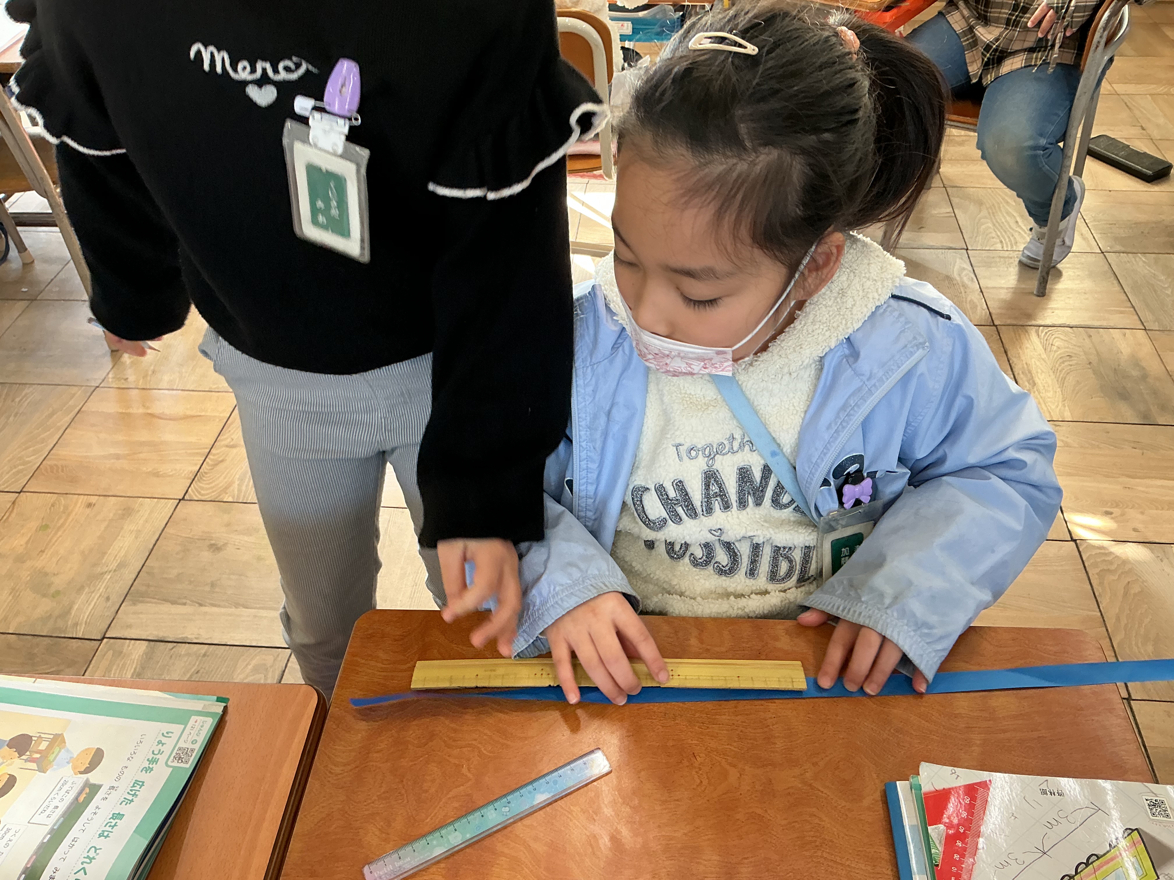 「思っていたより長い!」「100cmをこえていたよ!」など、子どもたちは楽しそうに友だちと比べながら測ることができました。