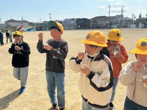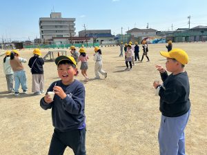 青空の中で、2年生みんなでシャボン玉をしました。風にのってきらきらと飛んでいくシャボン玉に、目を輝かせていました。