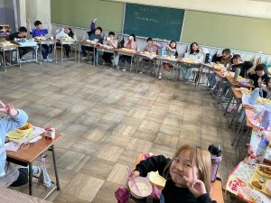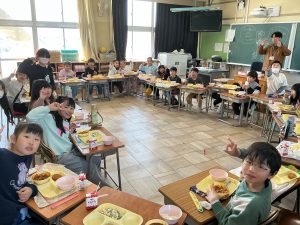 2年生最後の日には、輪になって給食を食べました。輪になったことで、みんな笑顔で給食を食べていました。