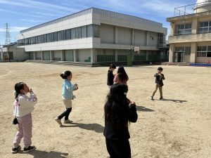 2年生青空の中で、2年生みんなでシャボン玉をしました。風にのってきらきらと飛んでいくシャボン玉に、目を輝かせていました。